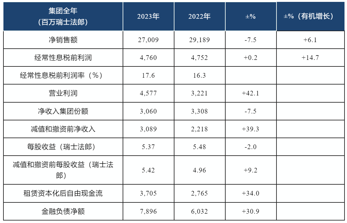 据悉,豪瑞集团2023年全年净销售额270.09亿瑞士法郎,经常税前利润47.60亿瑞士法郎,行业领先的经常税前利润率为17.6%;租赁资本化后自由现金流37.05亿瑞士法郎;每股收益上涨9%,达到5.42瑞士法郎;提议将股息增加12%,达到每股2.80瑞士法郎;2024年新股回购10亿瑞士法郎;2024年前景向好。